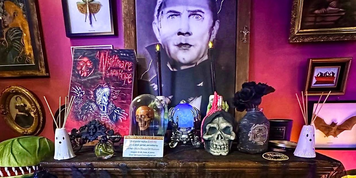 We have a wide array of unique, vintage, and haunting artworks. Some pieces were designed by members of our staff, such as our Nightmare in New Hope commemorative poster (@halls_house_of_horrors). We even have vintage funerary photographs (some including historical descriptions). Wander our store and find what speaks to you!